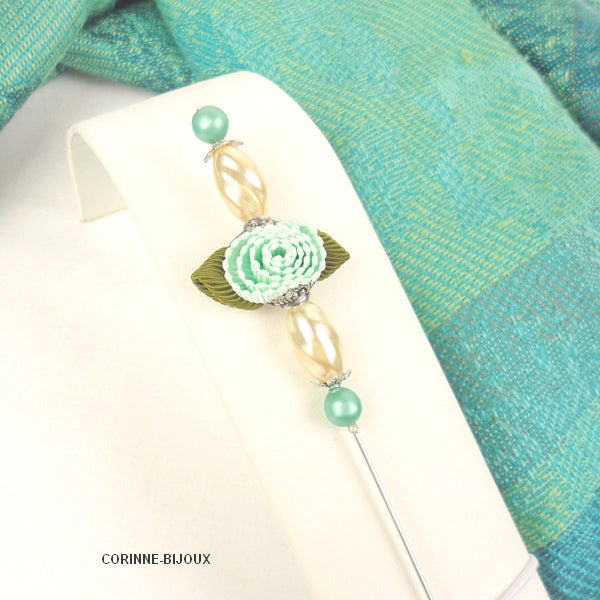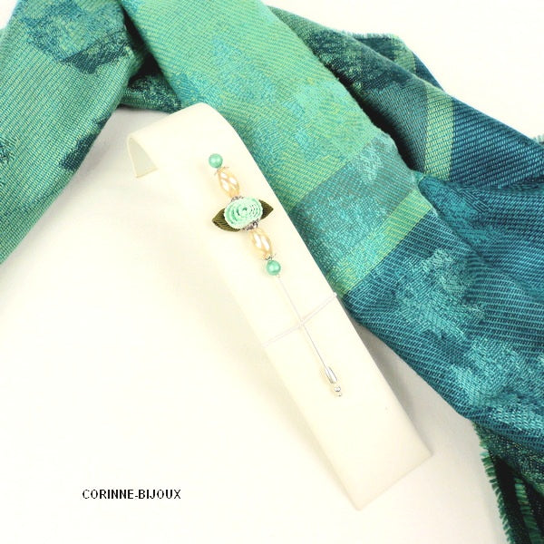 Cette broche originale et raffinée,est composée d’une rose en tissu dans les tons bleu vert, complétée de perles blanches légèrement ondulée. Chaque extrémité se termine d'une perle couleur vert d'eau en rappel de la fleur.