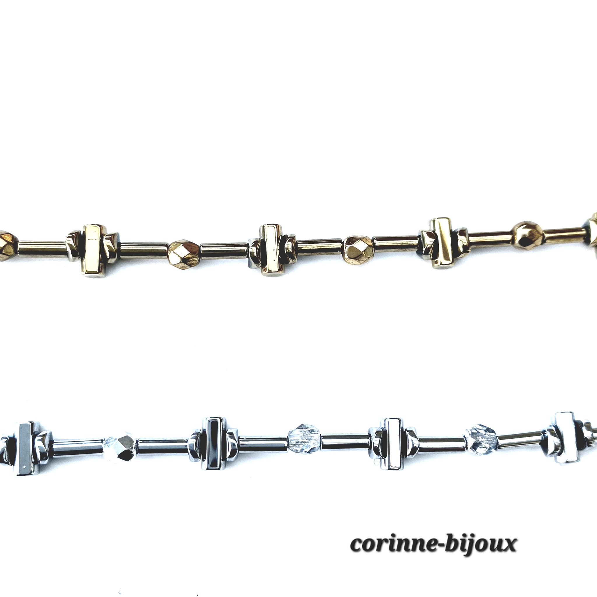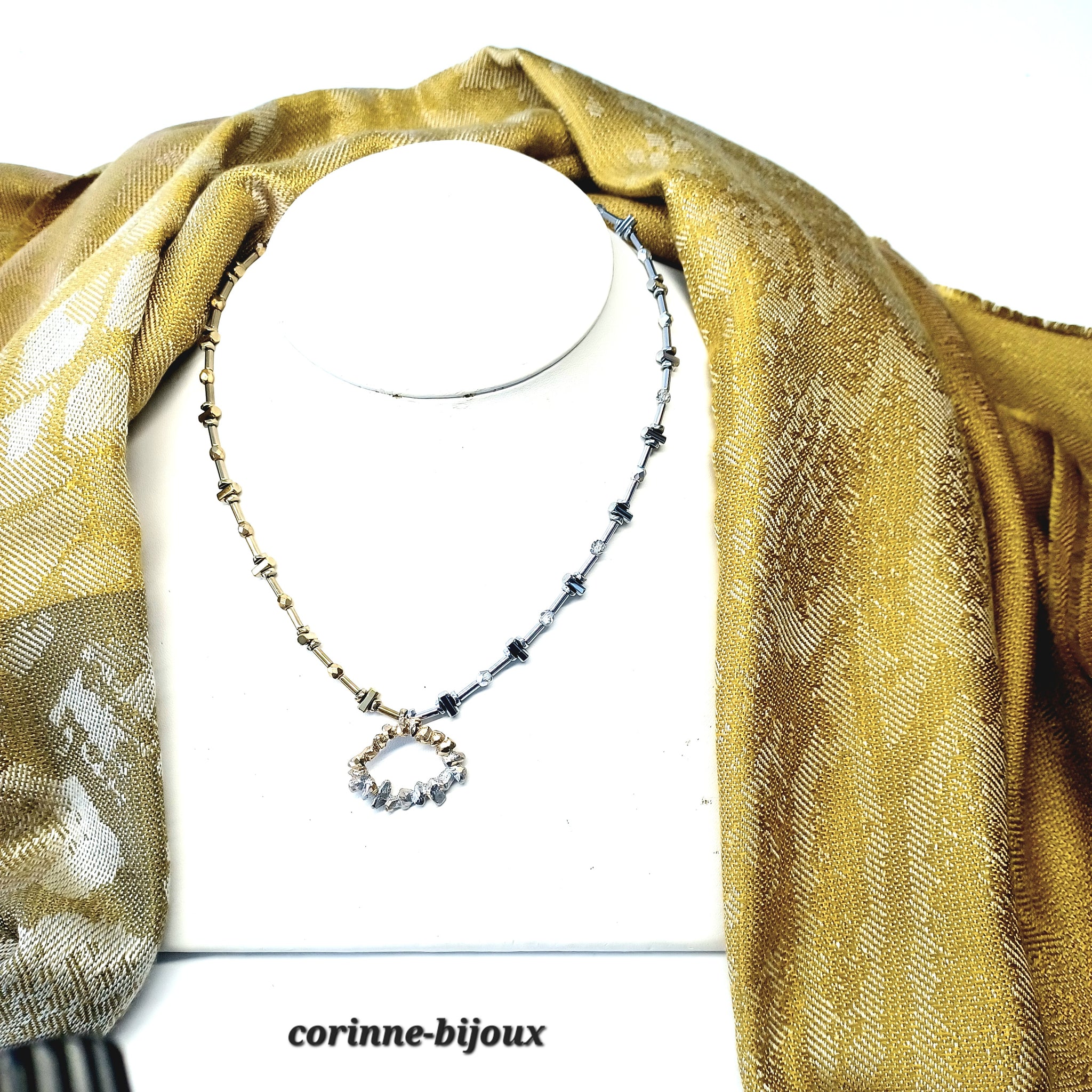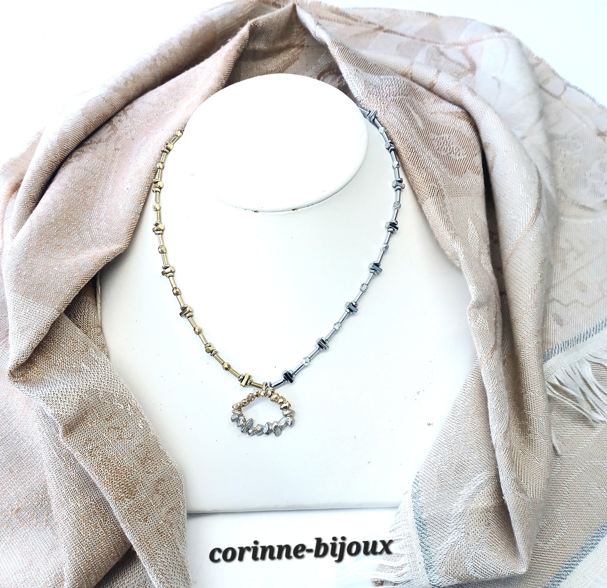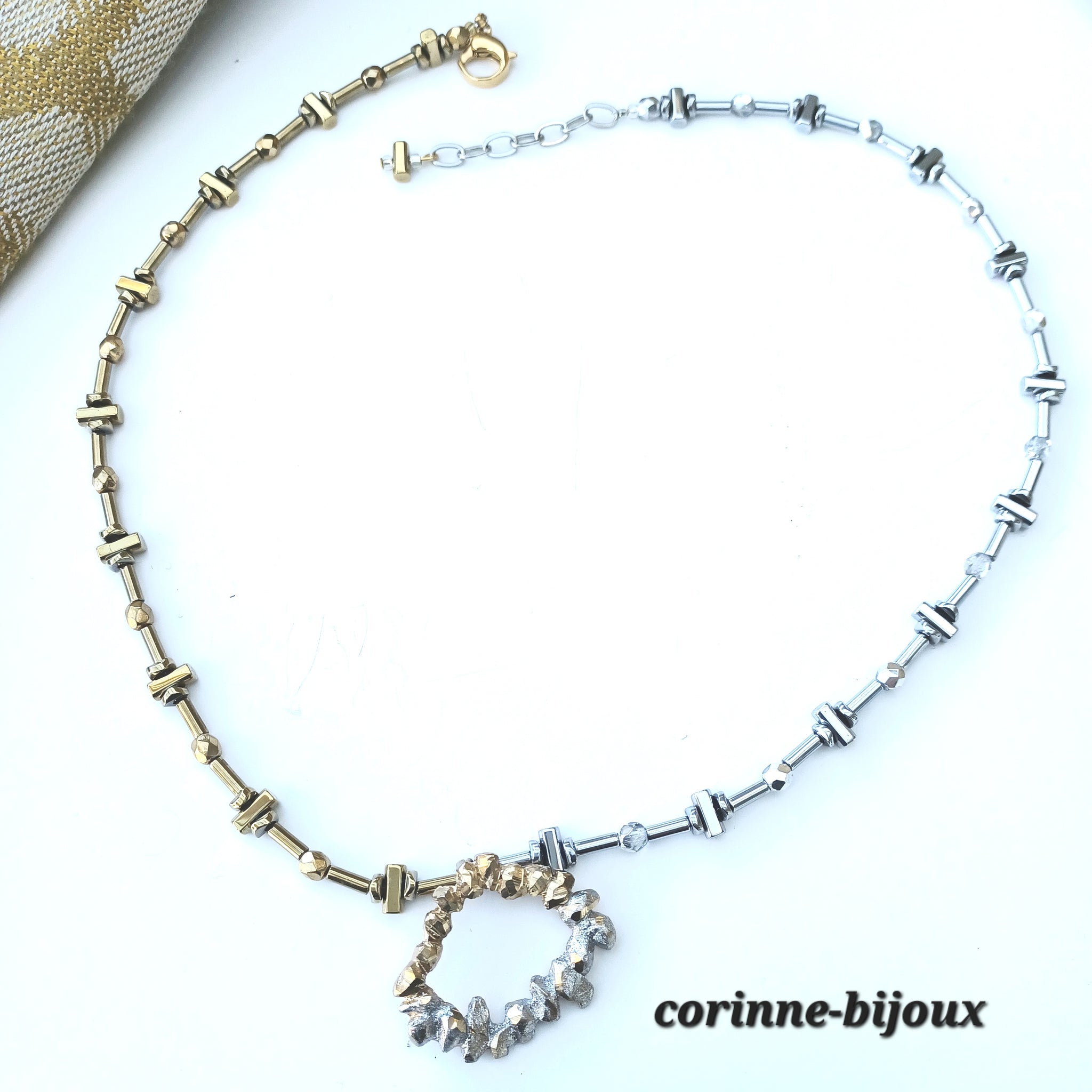 Le contour est composé de perles en hématite plaquage doré et argenté en forme de barres horizontales et de disques légèrement ondulés en rappel de l'irrégularité du pendentif.