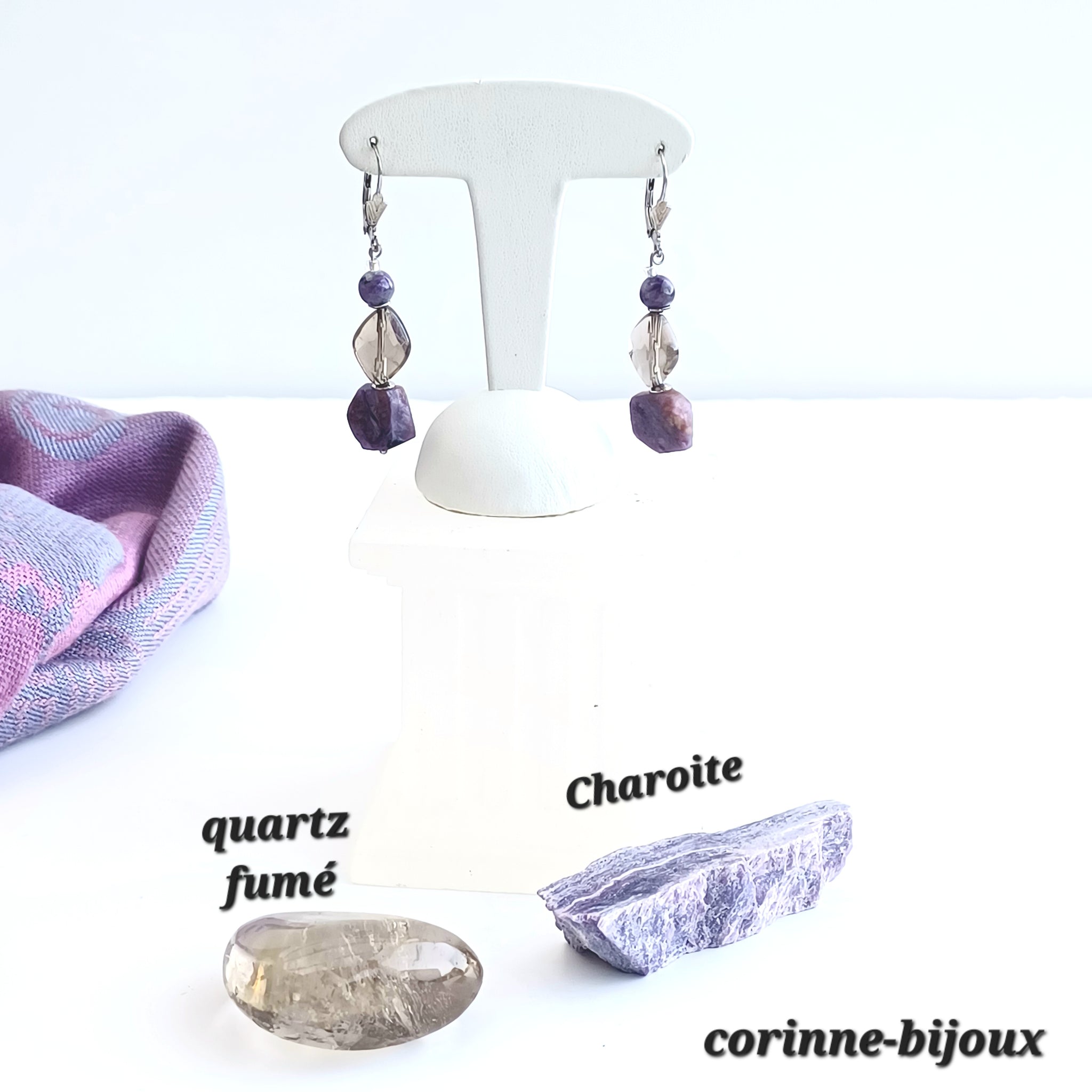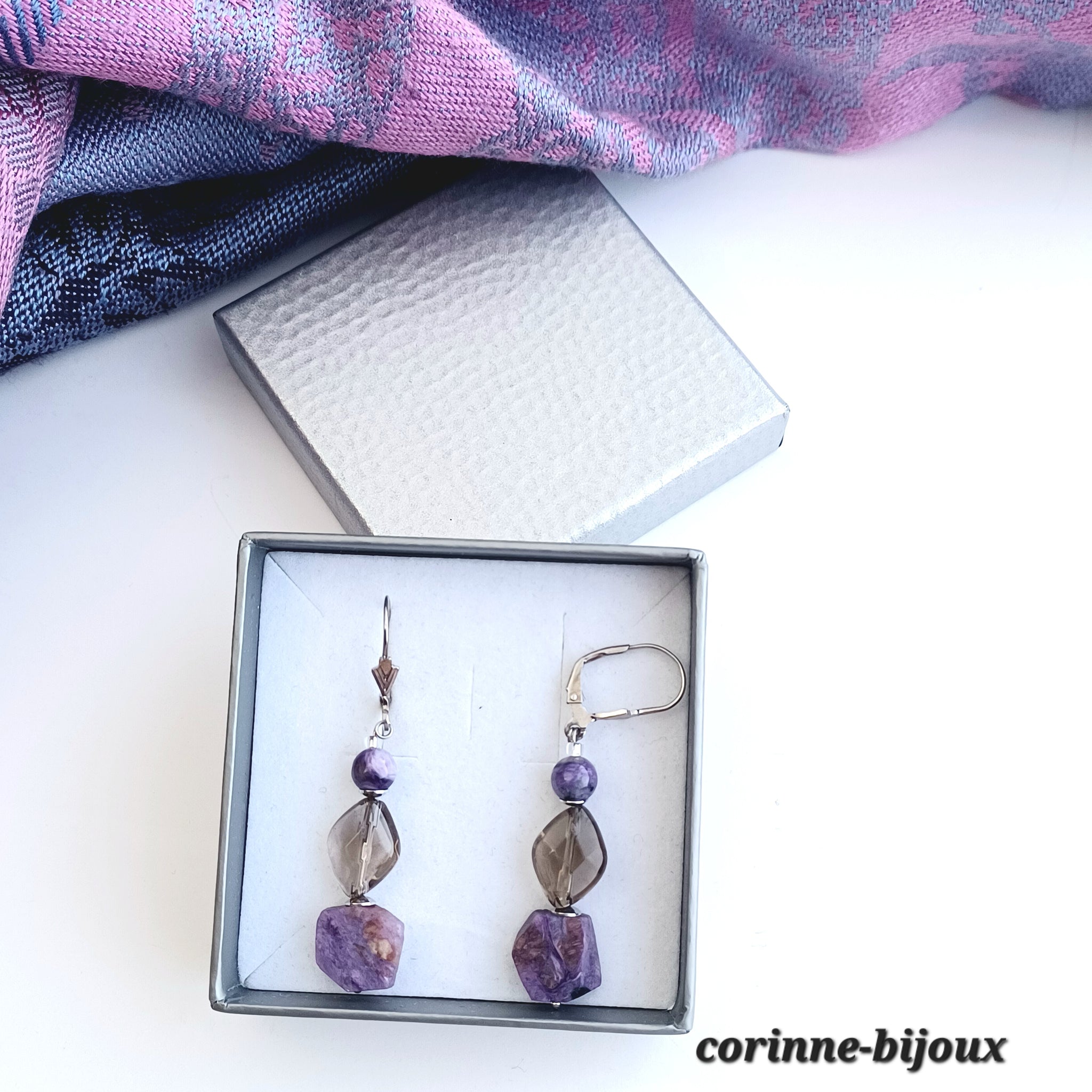 Description des boucles d'oreilles en charoite et quartz fumé