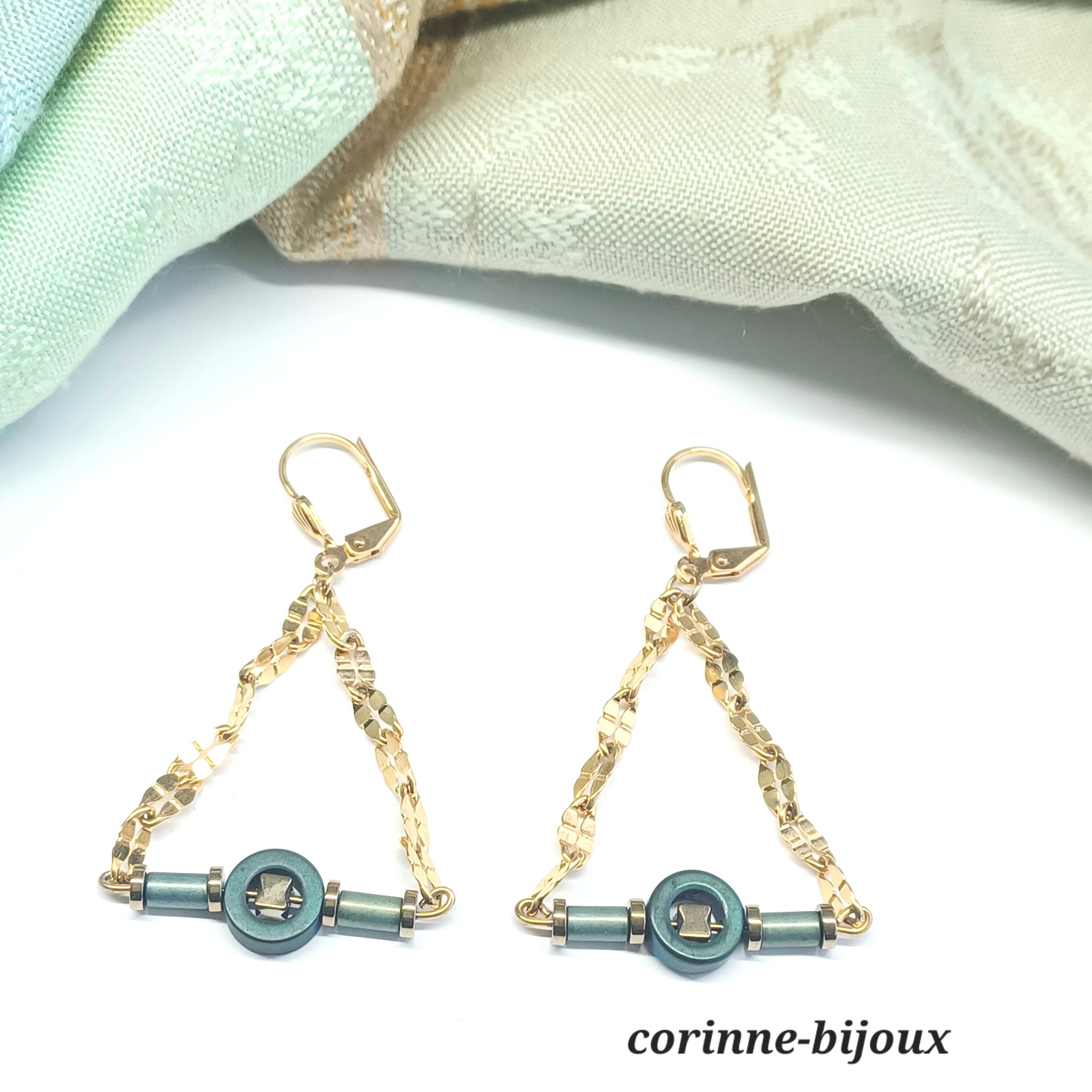 Boucles d'oreilles à la fois élégantes et fines. Toute l'élégance se trouve dans la chainette en acier doré inoxydable à la forme ondulée. Une finesse qui se retrouve dans la barre centrale composée de perles en hématite dans les tons vert irisé.