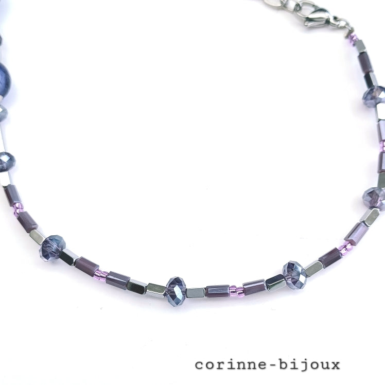 ajustable par quelques anneaux en métal argenté, terminé d'une perle en hématite argentée assortie au collier.