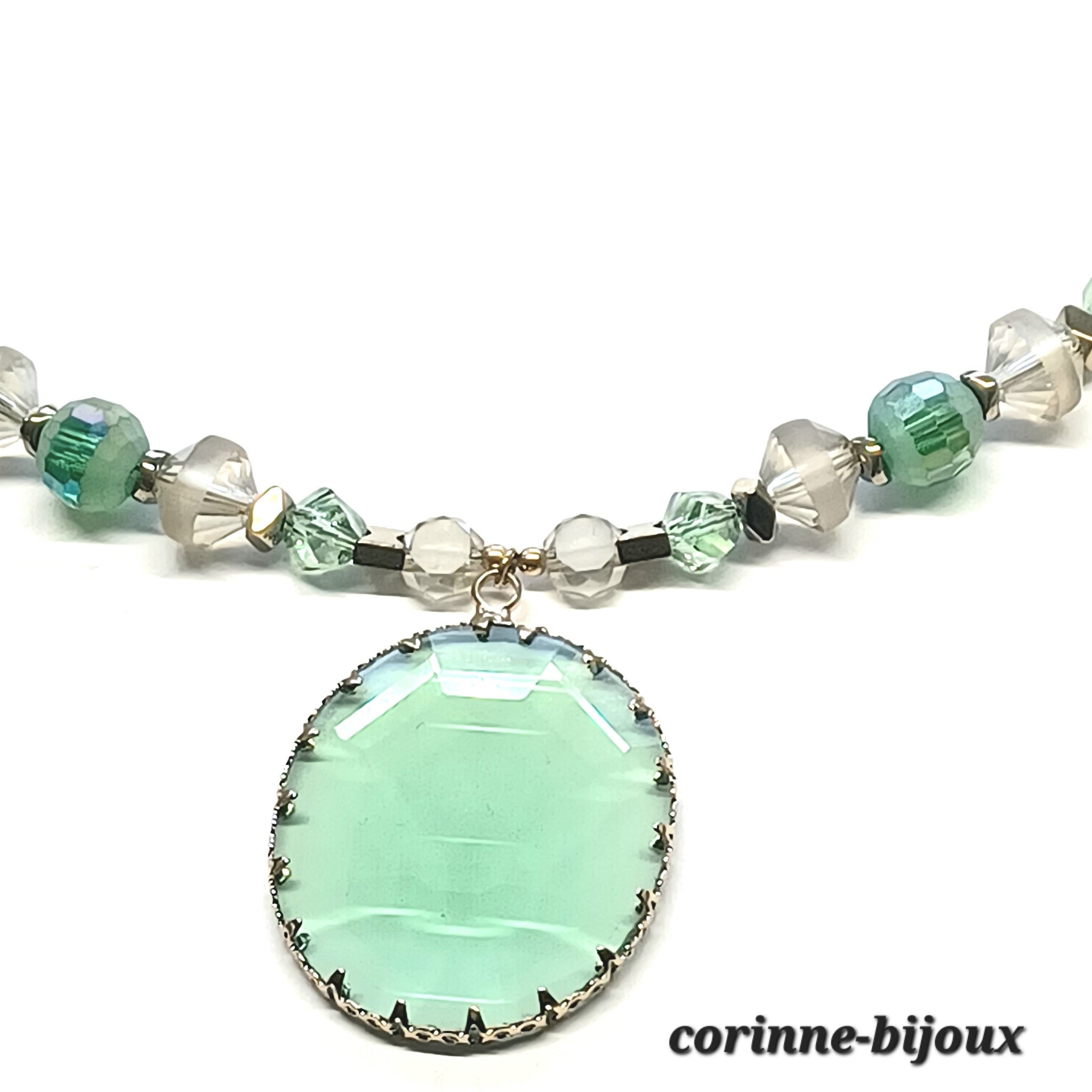 Collier élégant et raffiné par son pendentif vert clair plat de 3cm de diamètre en verre à facettes.