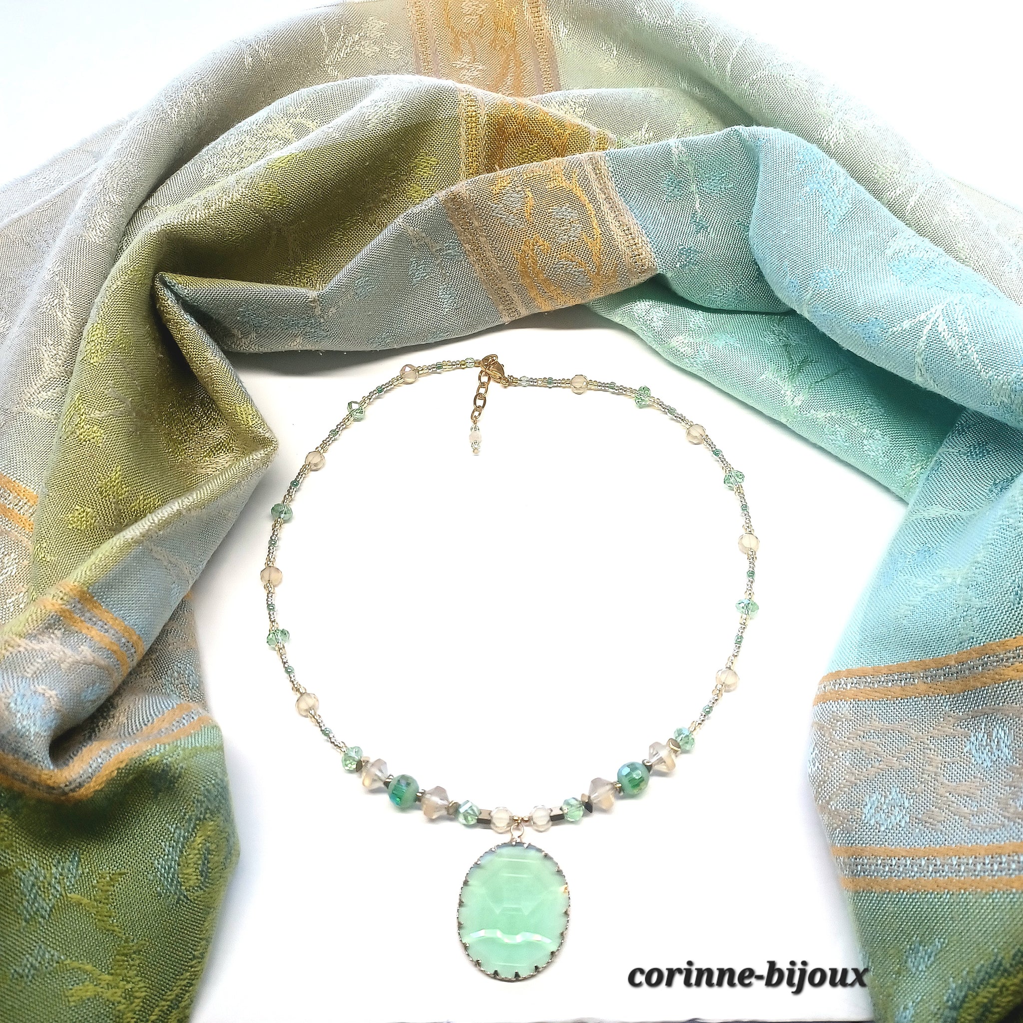 Toute l'élégance se retrouve dans les perles choisies. Des perles en verre facetées mi mat et brillantes dans les tons vert assorties au pendentif. D'autres perles en verre translucides d'un beige doré et écru ont été ajoutées pour former un ensemble harmonieux.