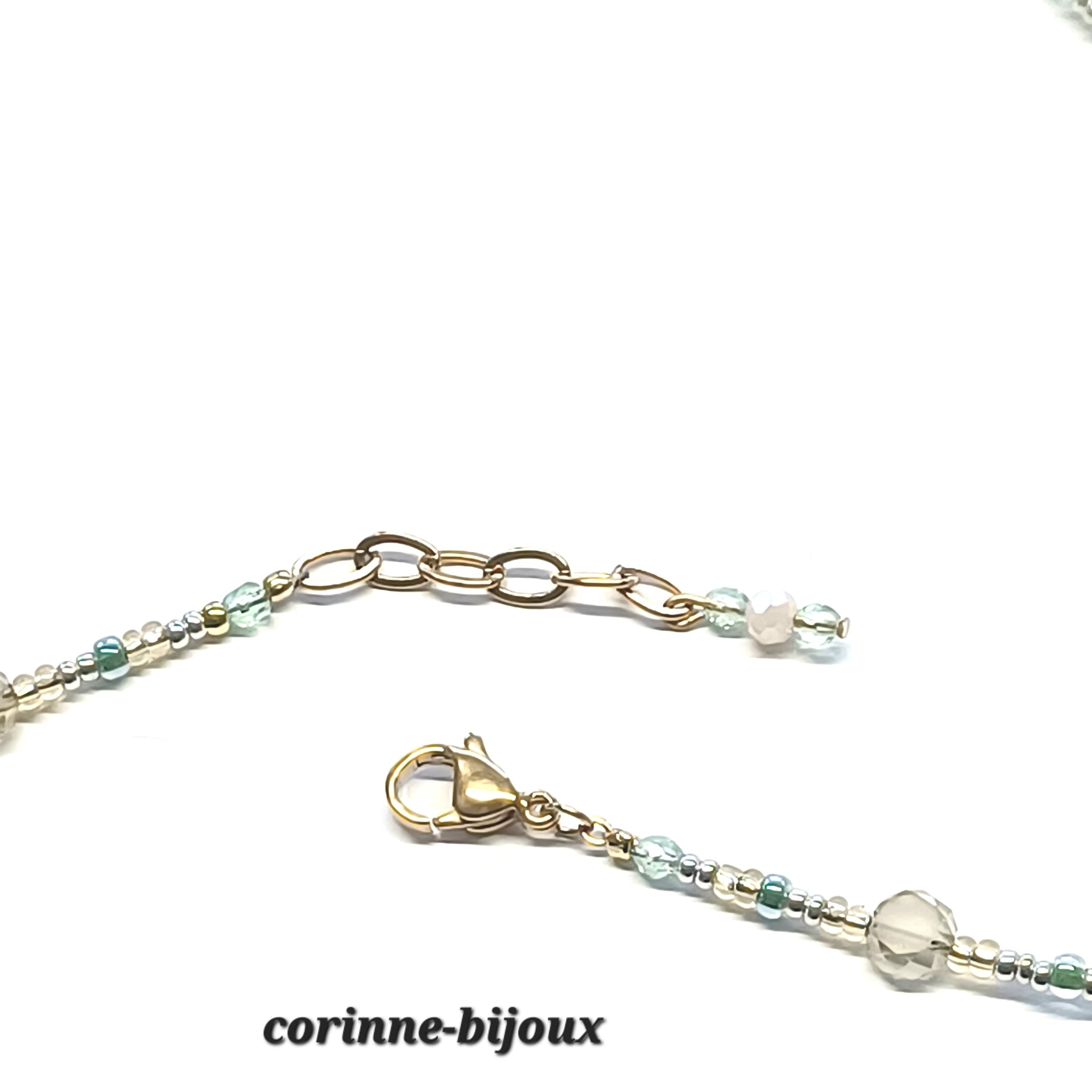 La longueur du collier de 44 à 47 cm est ajustable par quelques anneaux en acier doré terminé d'une perle écrue et verte assortie au collier.